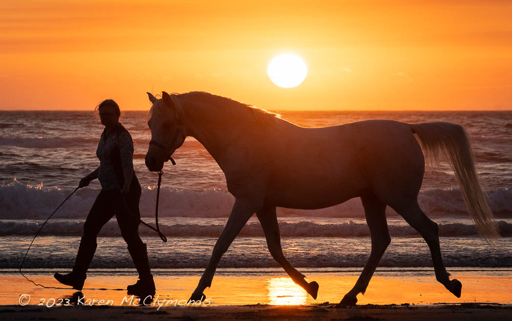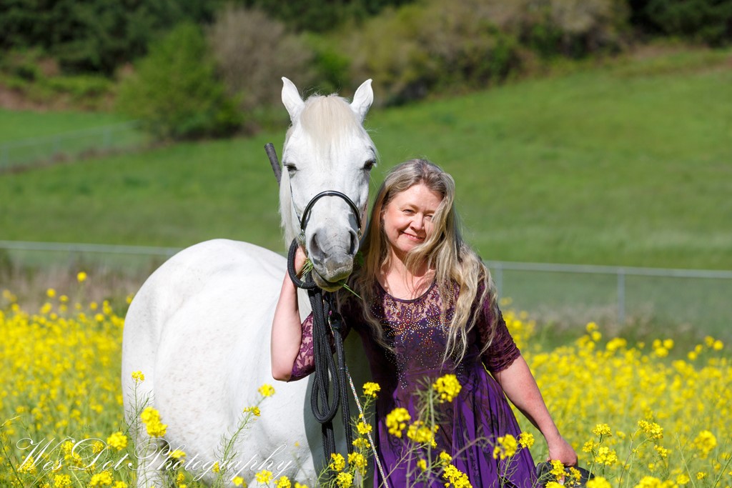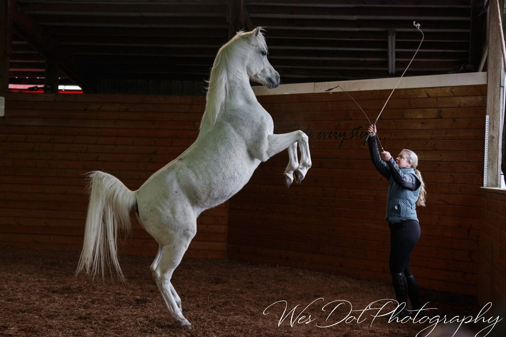 Karen has since owned a variety of horses but the one that remains closest to her heart is Cavalli. After trail rides and getting to know each other, she realized that her beautiful grey Arabian enjoys performing tricks. Following her horse’s cue, she found Lukas Bardue, who has been the driving force teaching Cavalli and Karen the art of liberty.
